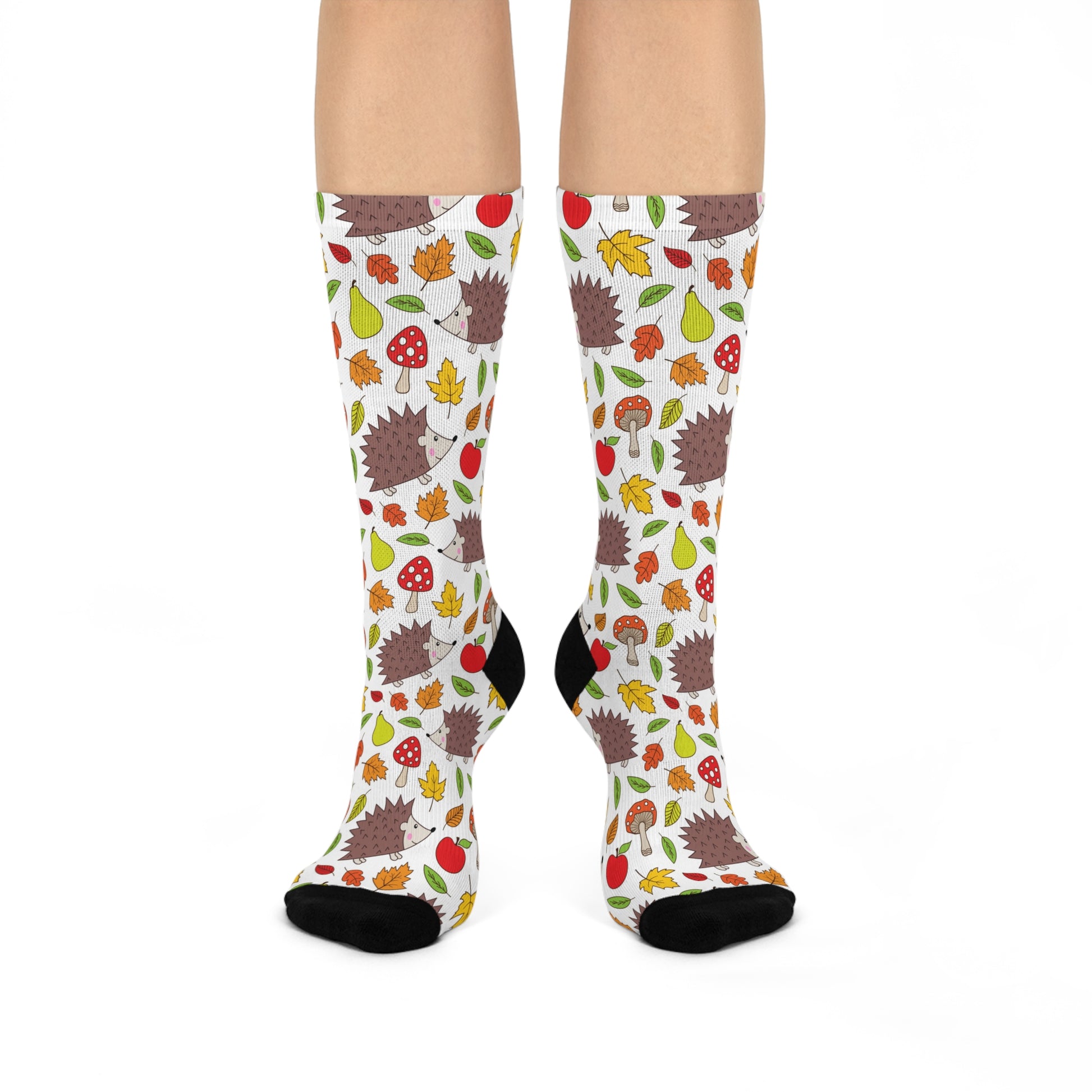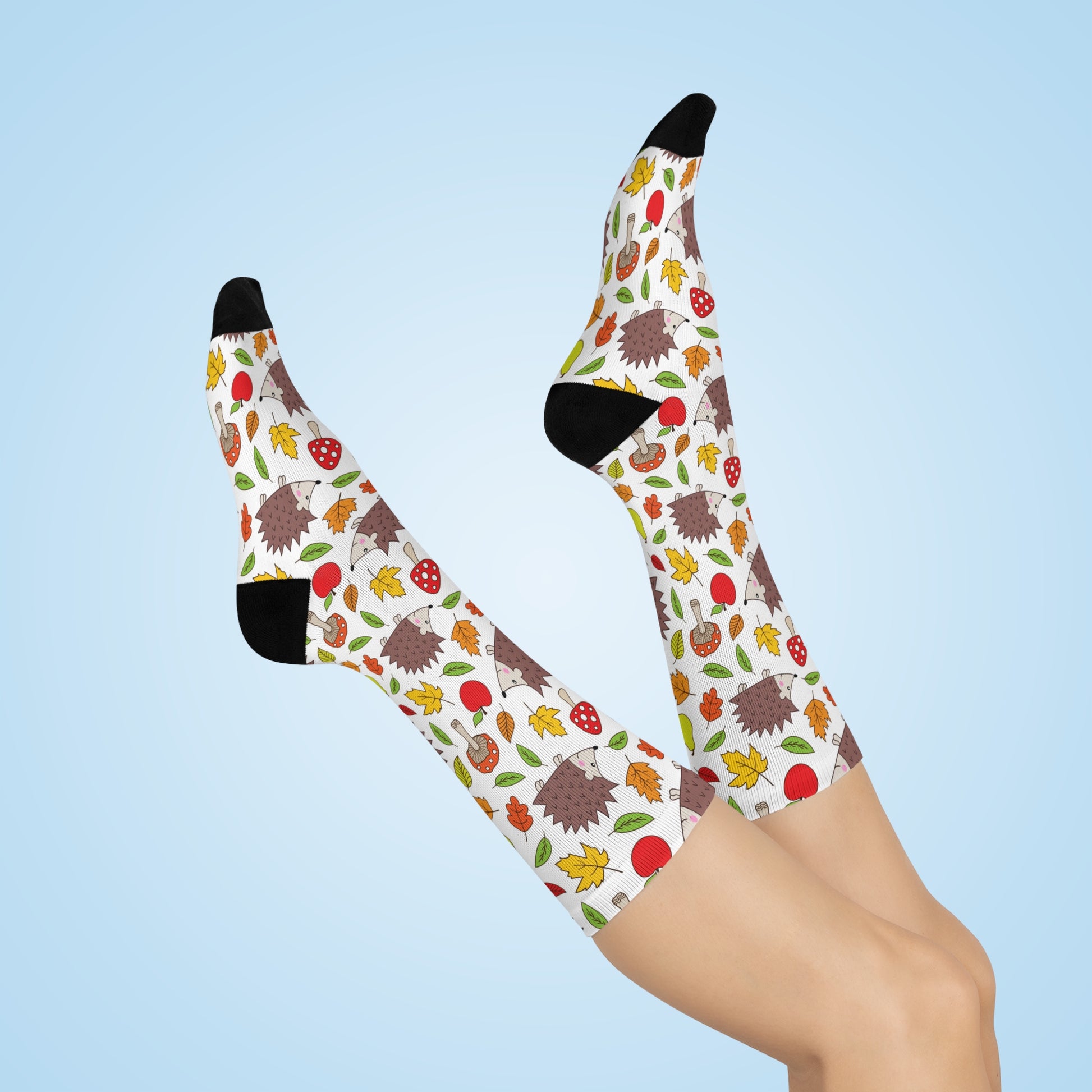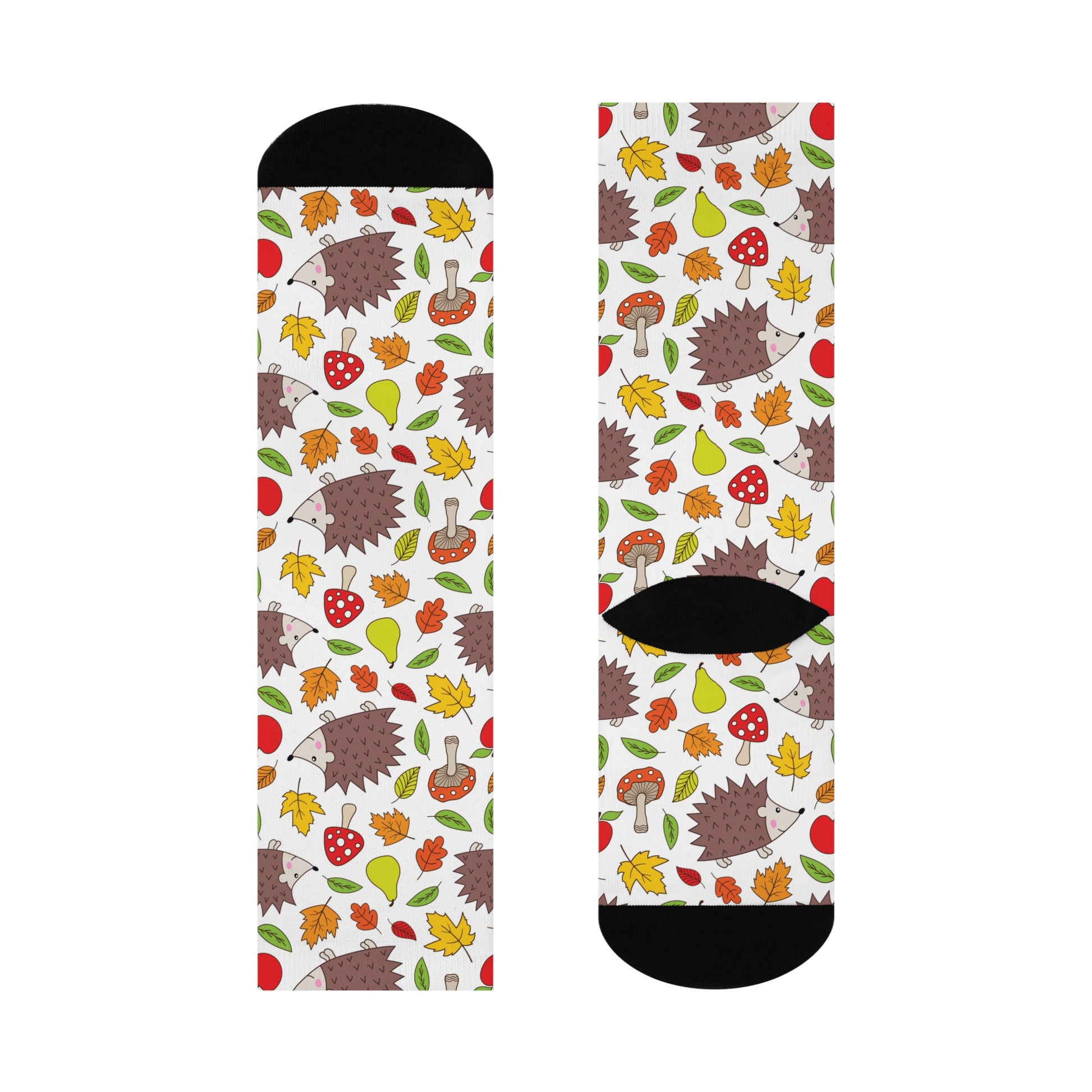 Featuring a delightful all-over print of autumn leaves, mushrooms, and friendly hedgehogs, these socks are perfect for adding a bit of whimsy to your casual wear. Whether you’re lounging at home or heading out with friends, these socks will make your feet feel cozy and stylish. Slip them on for a comfy vibe during fall festivities or casual outings.
