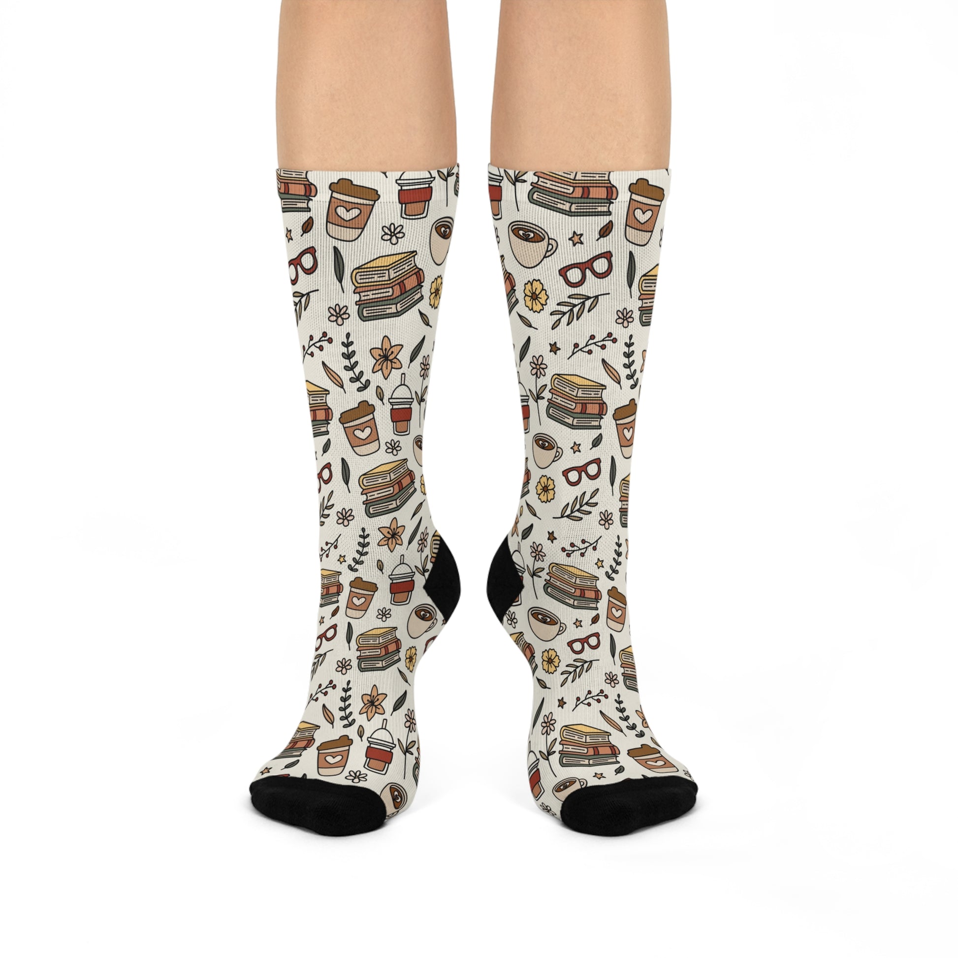 Crew length. All-over print design with solid black toe and heel. Cushioned bottoms. Material: 73% polyester, 18% nylon, 3% cotton, 6% spandex. One size fits women's size 5 US up to men's size 12 US.