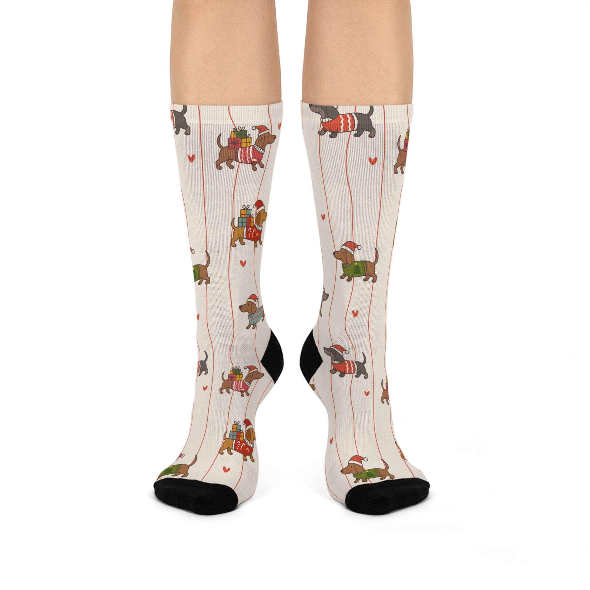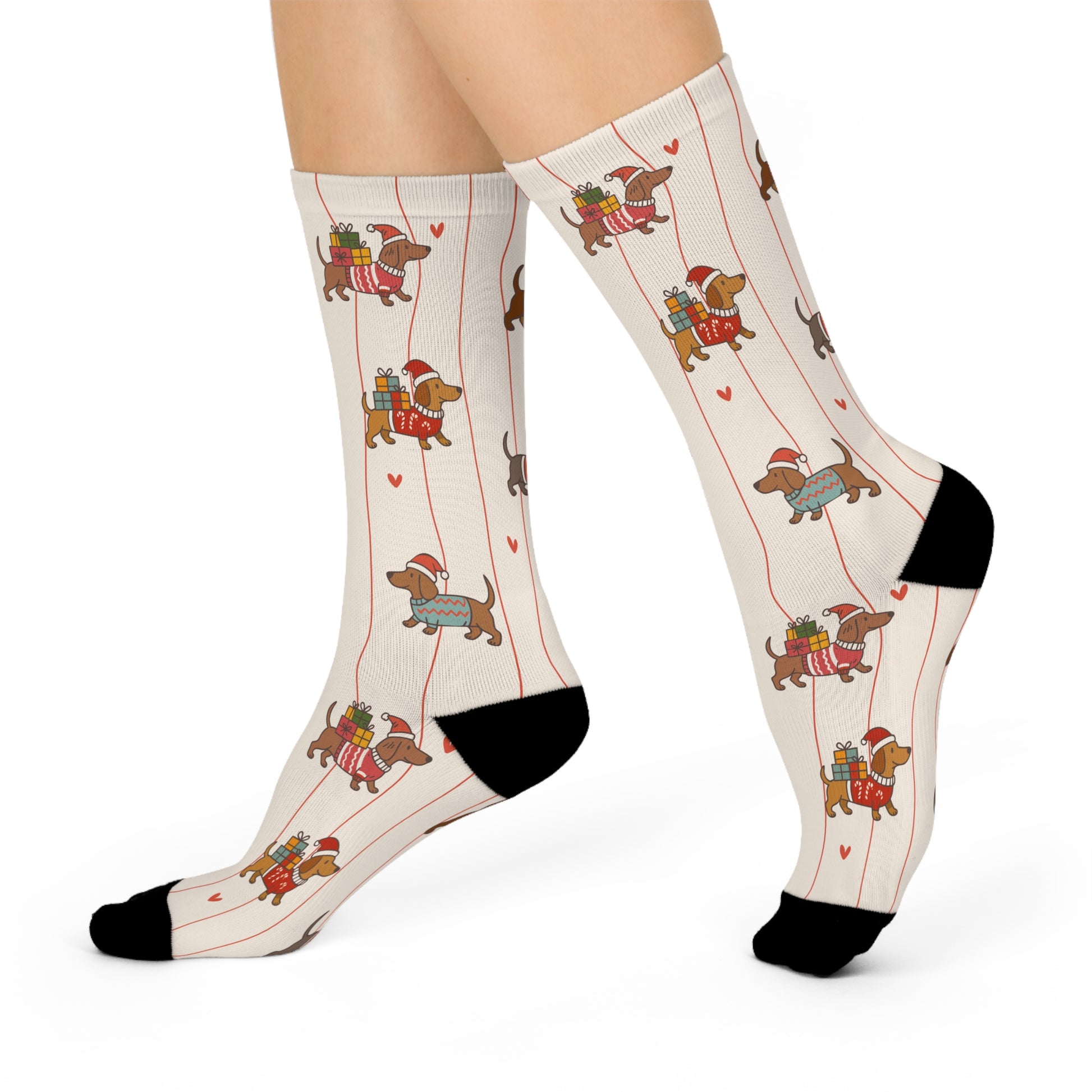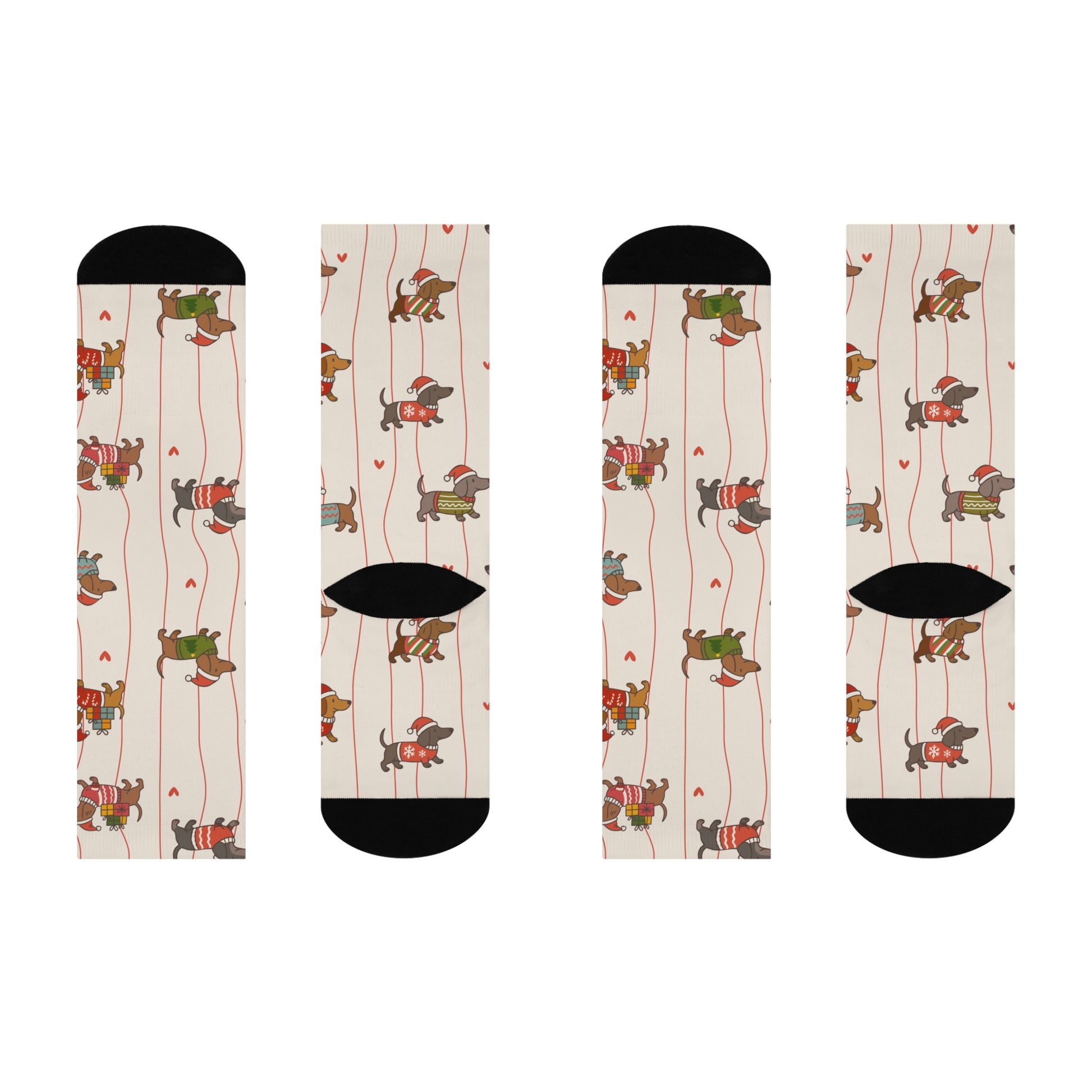 Tiny dachshunds decked out in scarves and little backpacks march up slim vertical stripes, tiny hearts tucked between them like secret notes. Slip them on for a quiet coffee run, a cozy night in, or to add a wink of personality to a layered winter outfit.