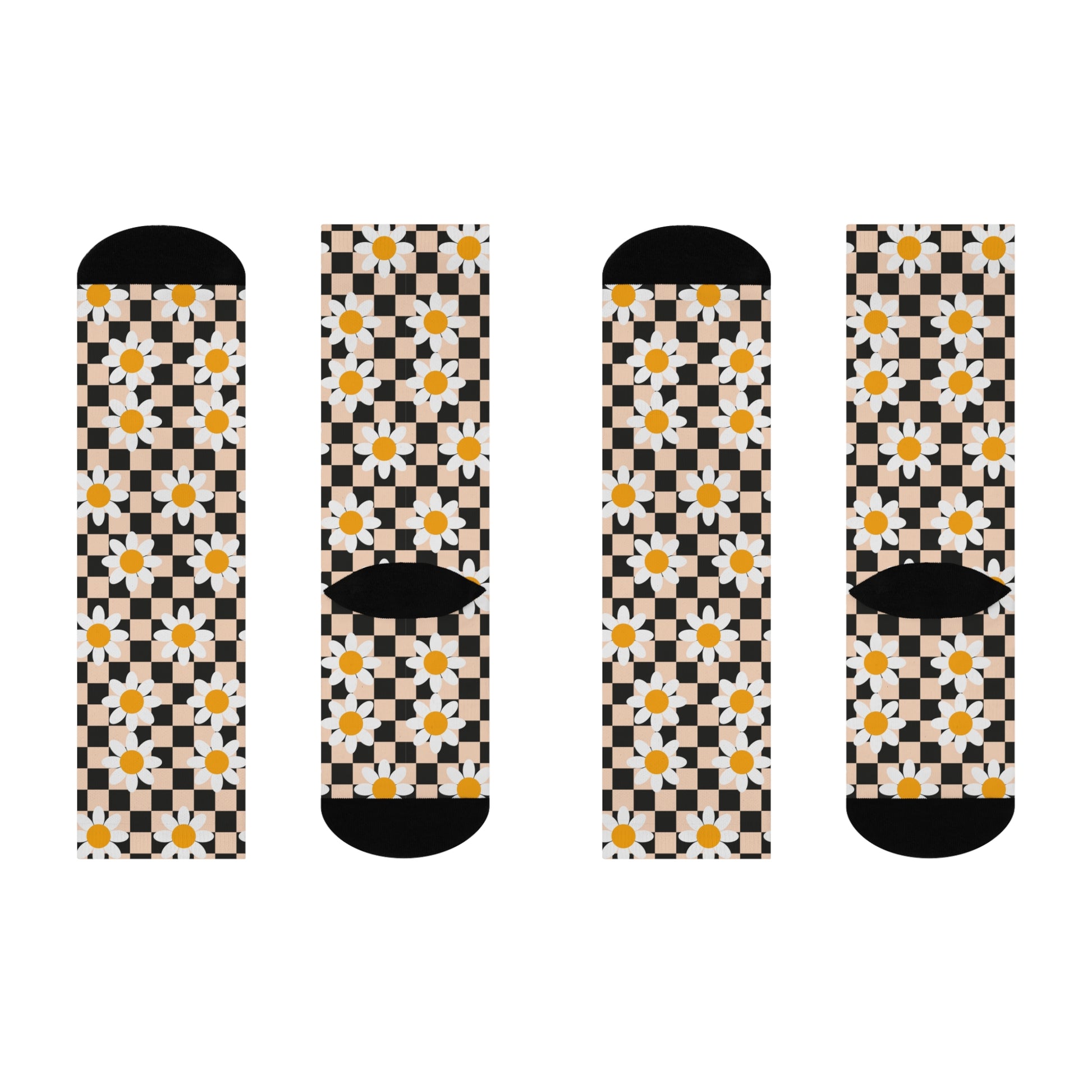 Elevate your sock game with these vibrant cushioned crew socks, perfect for adding a pop of personality to any outfit. The all-over print features a playful checkerboard pattern complemented by cheerful daisies, making these socks not just an accessory but a statement piece. Ideal for casual outings, cozy days at home, or sporty adventures, they bring comfort and style to your everyday life. Whether you're dressing up for a family gathering, preparing for a birthday party, or just enjoying a laid-back weekend, these socks are the perfect choice for anyone who loves to express their unique style.