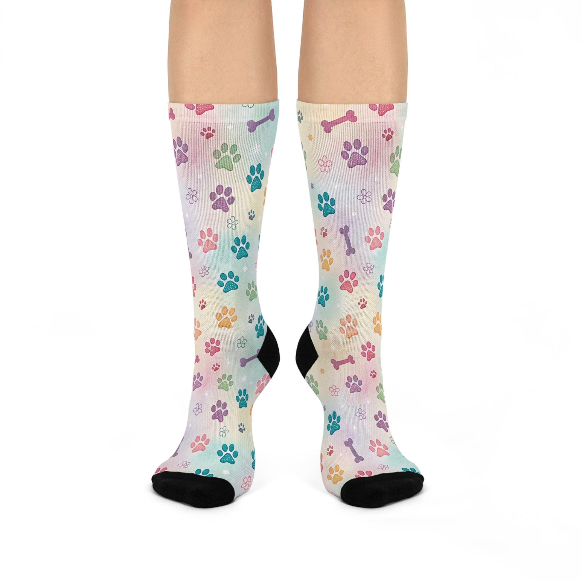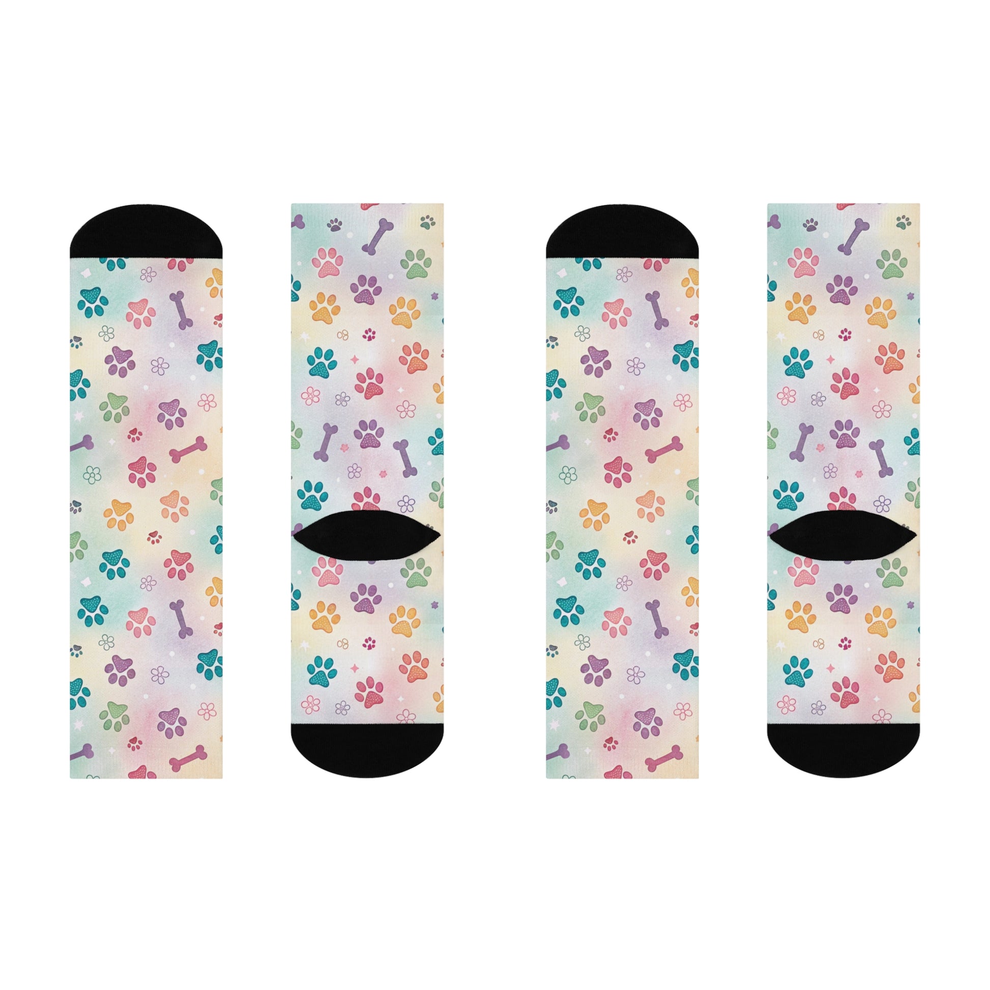 Featuring a playful all-over print of paws and bones, these socks are perfect for animal lovers or anyone looking to add a fun twist to their wardrobe. Celebrate your love for pets on occasions like birthdays, holidays, or just because – these socks make a thoughtful gift for friends, family, or even yourself! Crew length for casual, dress, or active occasions. All-over print design with solid black toe and heel.