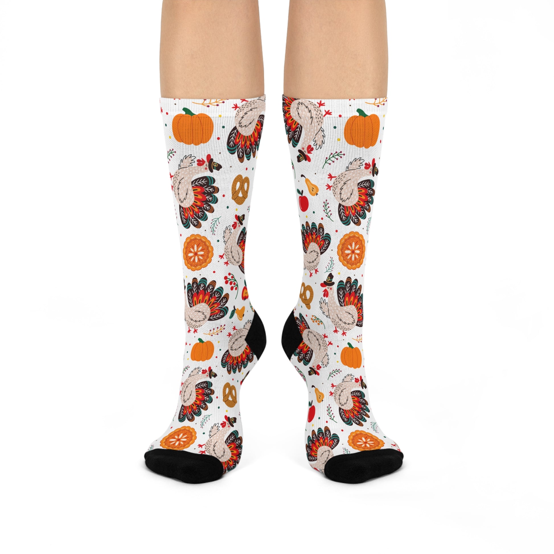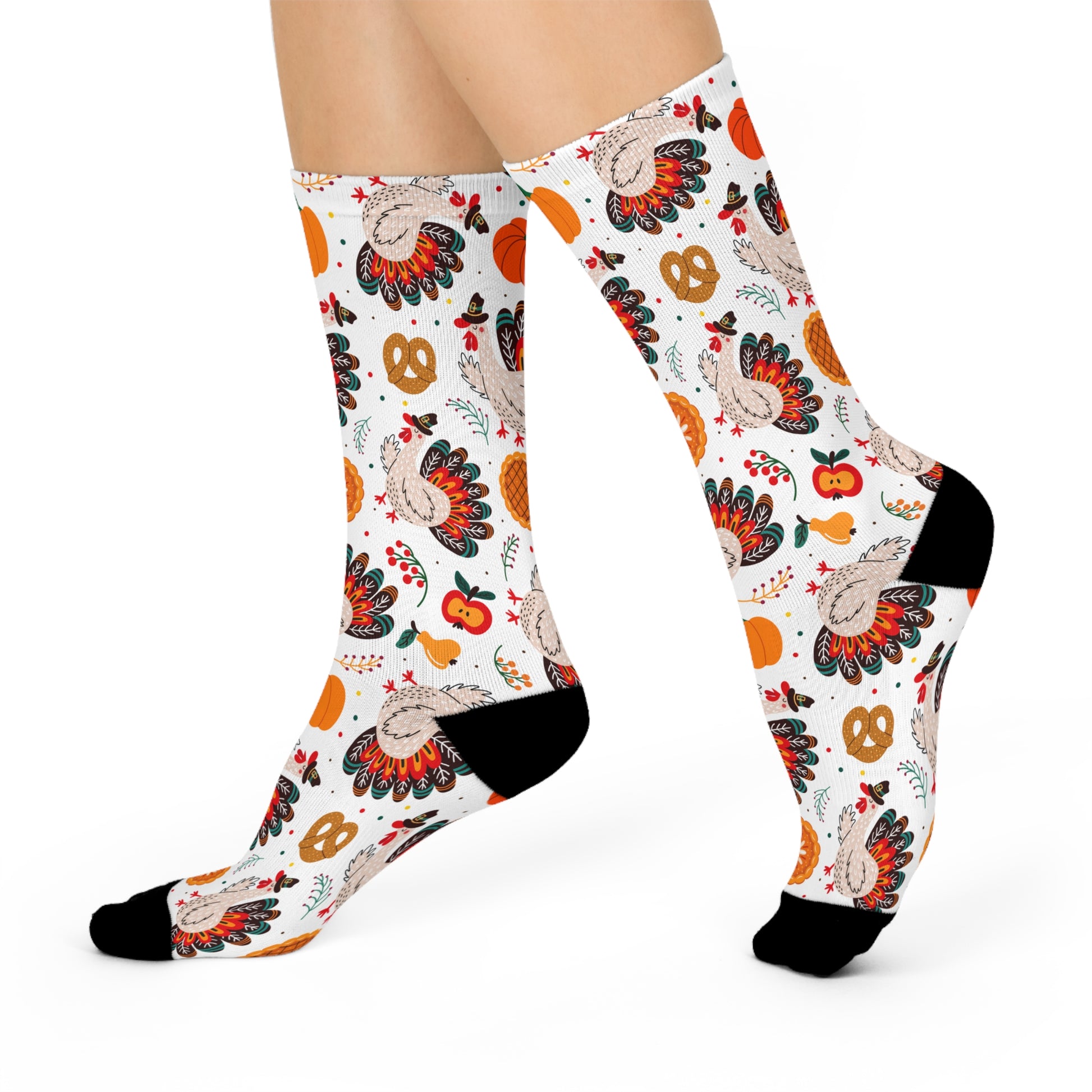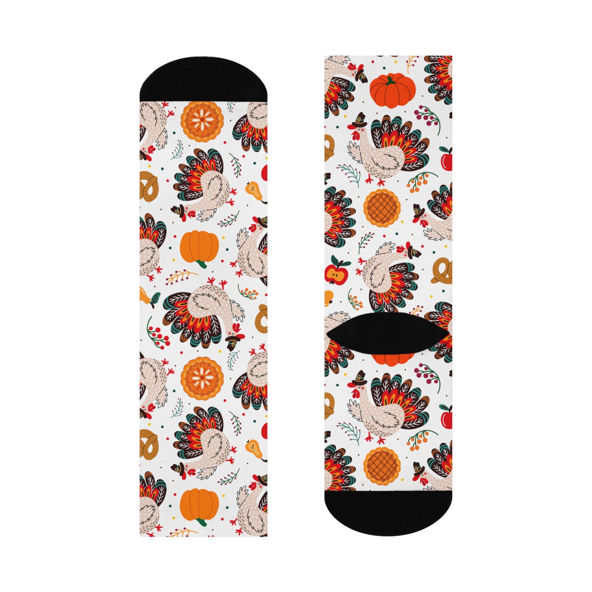 With a vibrant all-over print featuring festive fall motifs, these socks bring a cheerful vibe to any casual or activewear ensemble. Ideal for family gatherings, holiday celebrations, or simply lounging at home, they cater to those who appreciate both comfort and creativity in their wardrobe. Whether you're hosting a Thanksgiving feast or cozying up for a night in, these socks add a touch of seasonal spirit while keeping your feet snug.