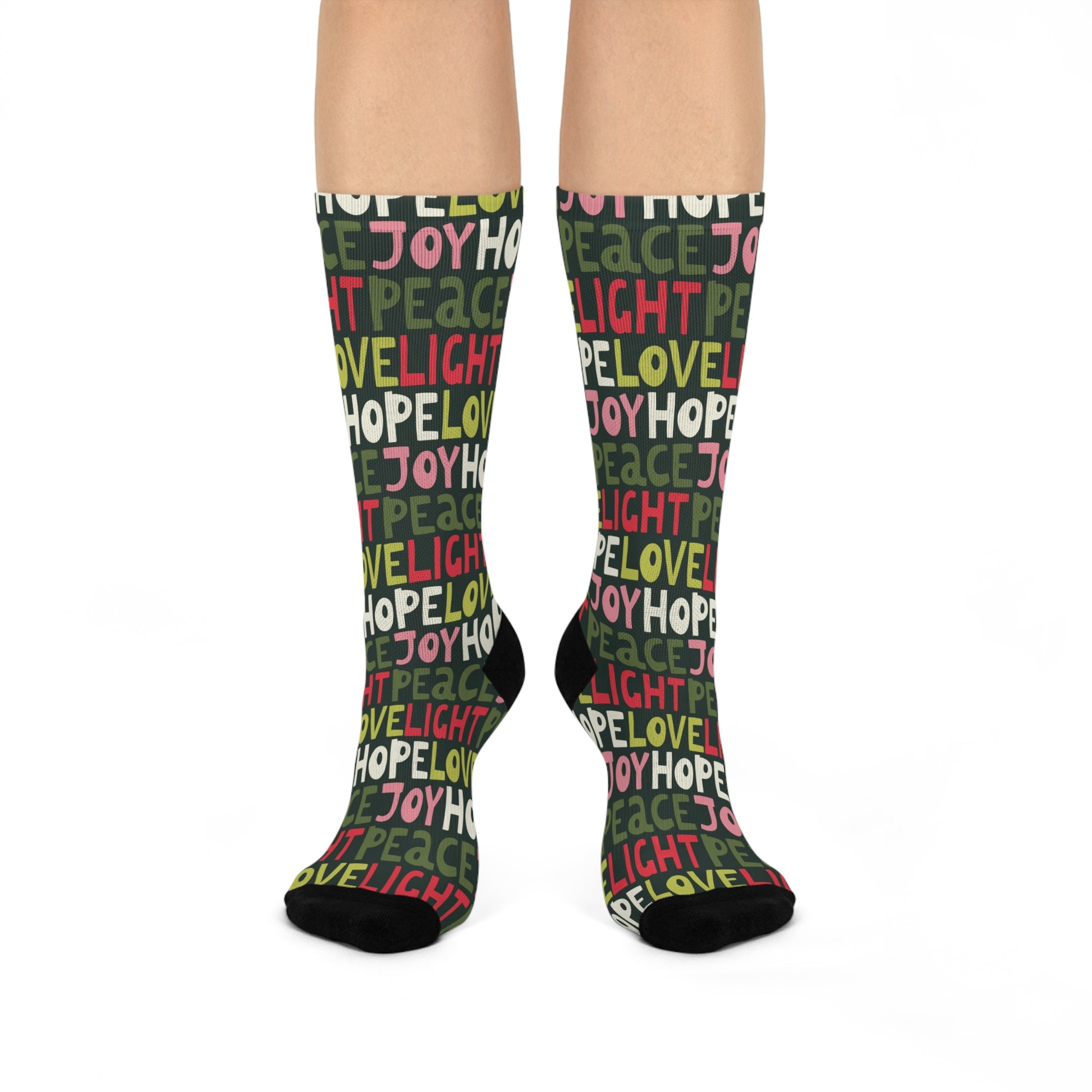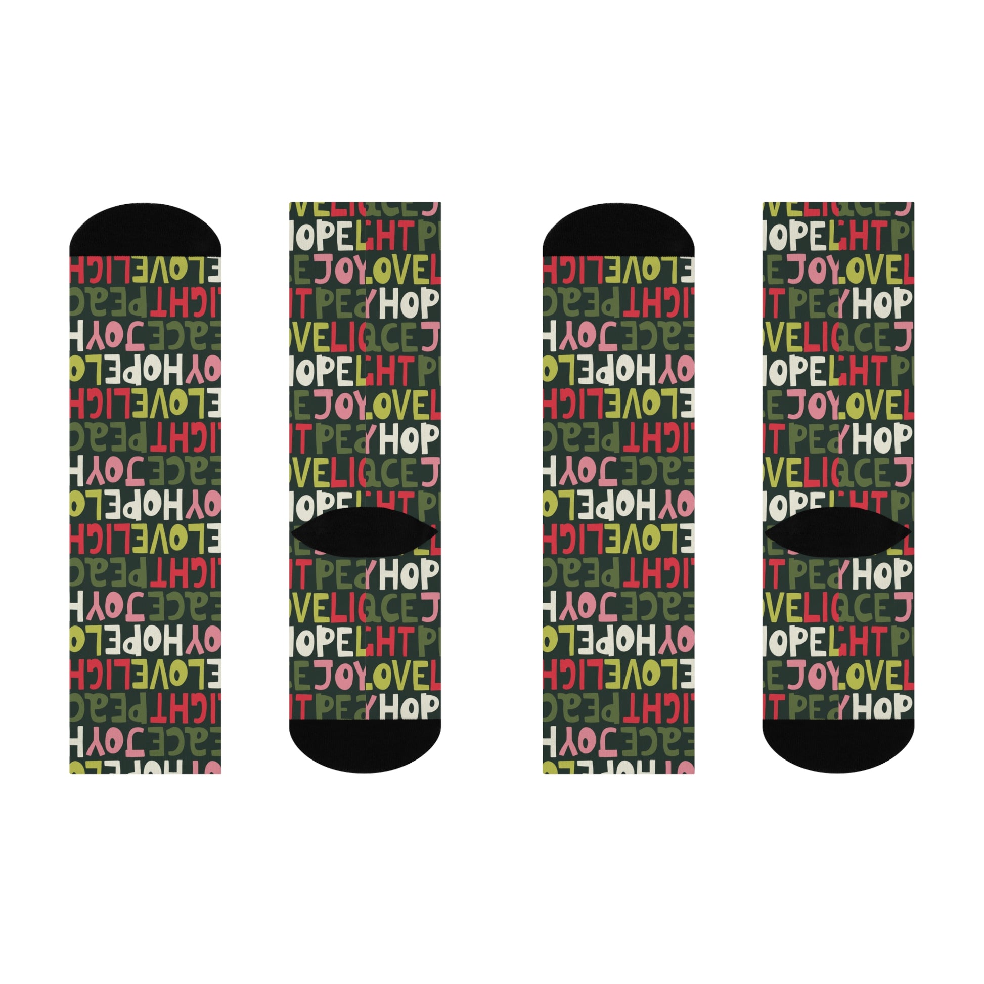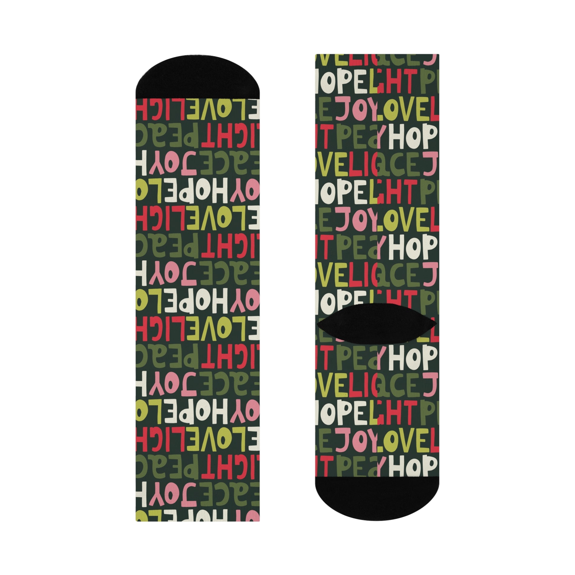 The vibrant design, featuring uplifting words 'Joy', 'Love', 'Peace', and 'Hope', creates a warm atmosphere perfect for spreading positivity. Perfect for gifting during the holidays, celebrations, or simply to brighten someone’s day, these socks are a must-have for your wardrobe.