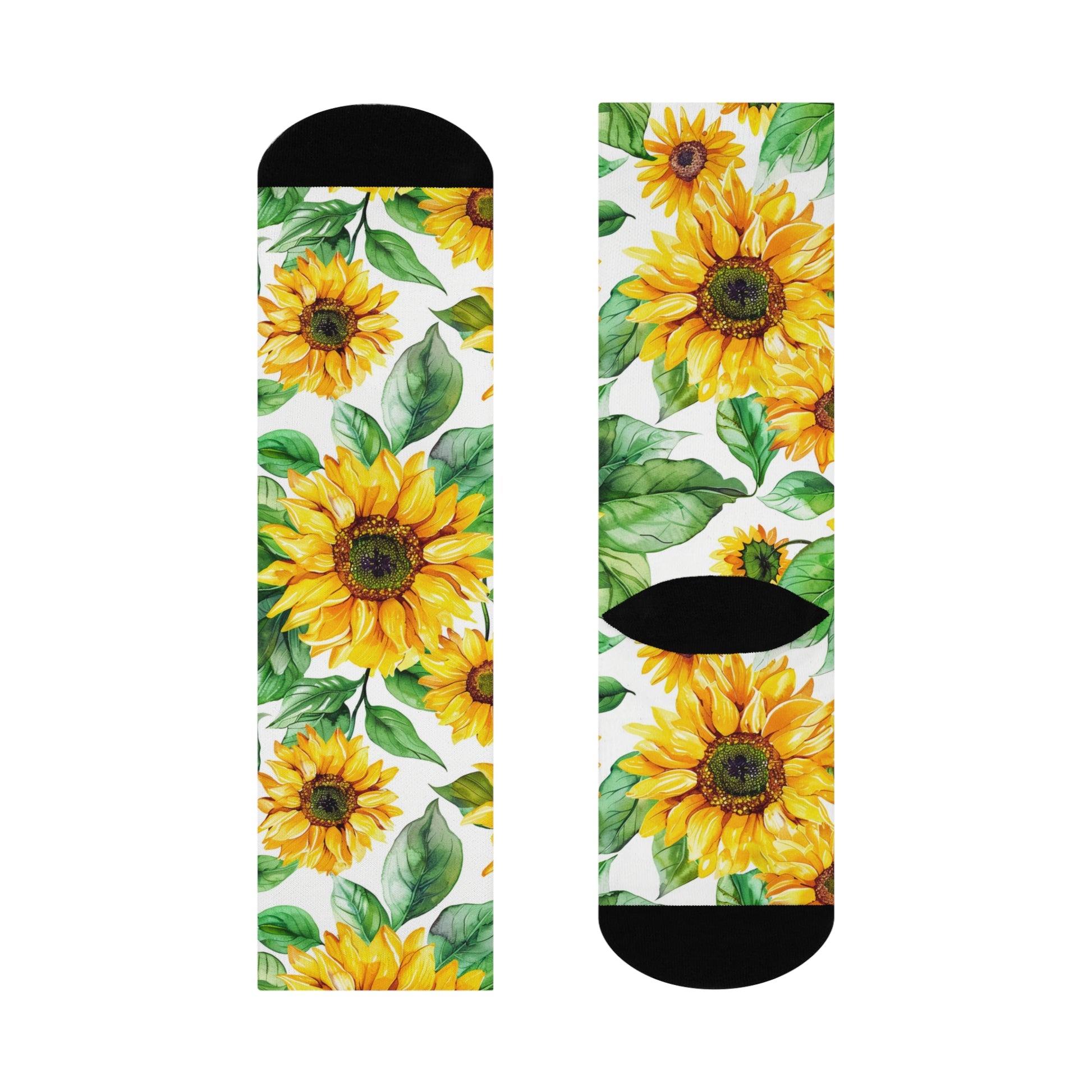 Sunflower blooms and lush leaves wrap the legs in bright watercolor warmth, while the black heel and toe add contrast and durability. Lightweight but supportive, the soft stretch fabric slips on easily and stays snug through long walks, workdays, or relaxed mornings with a cup of tea. Slip them on to lift a mundane outfit, layer them under boots for a countryside weekend, or wear them around the house when you want little moments of joy underfoot.