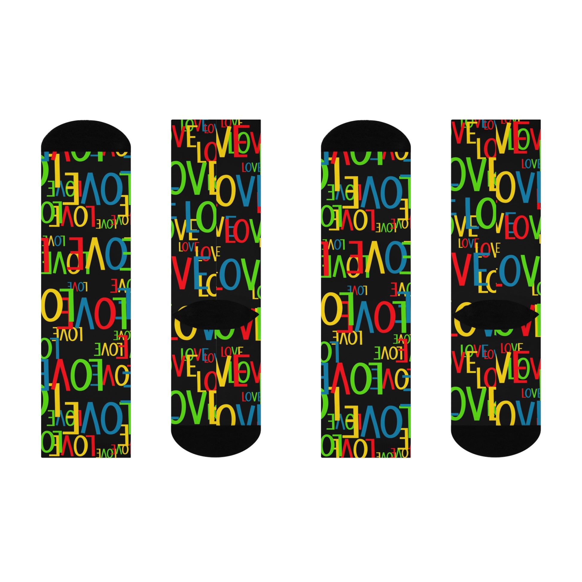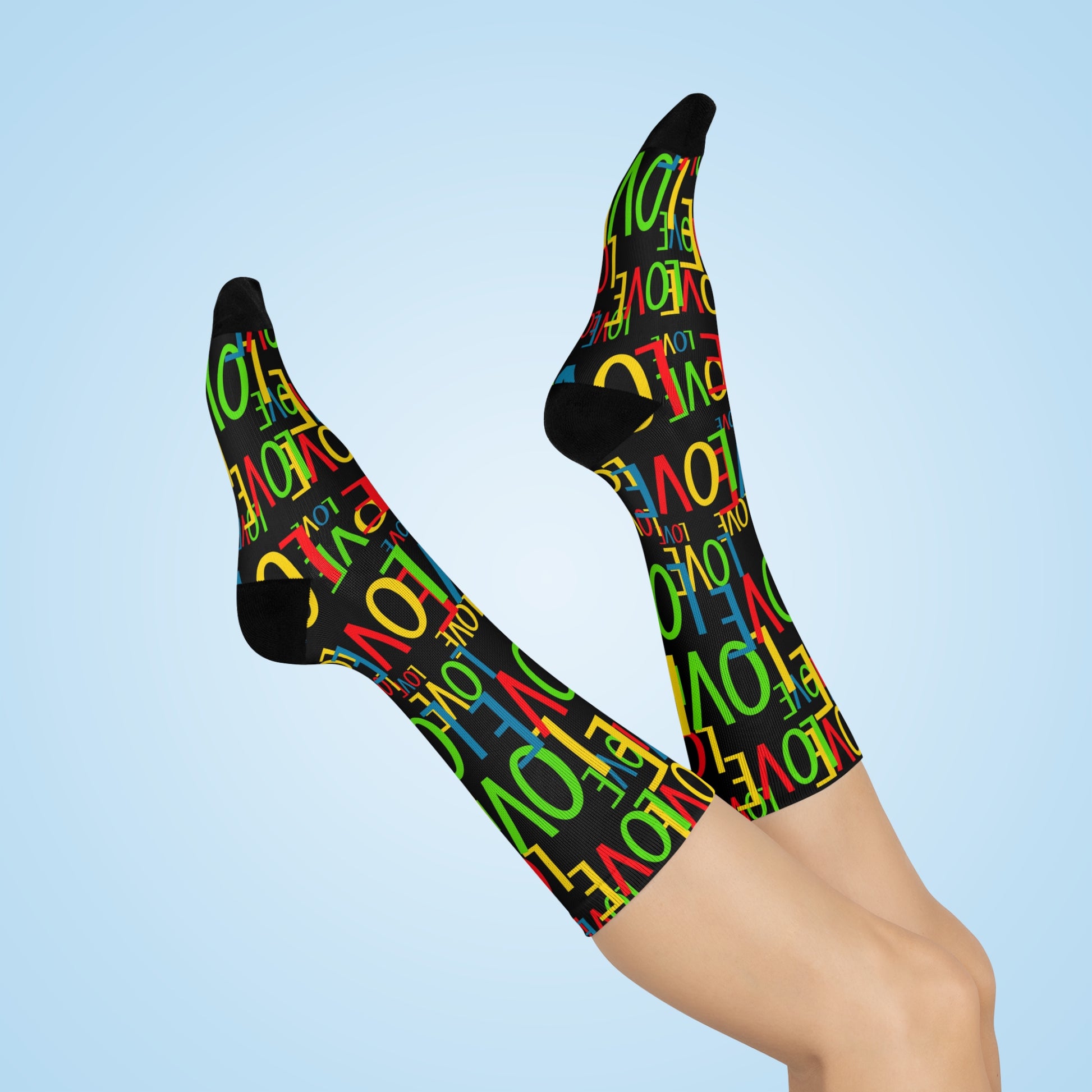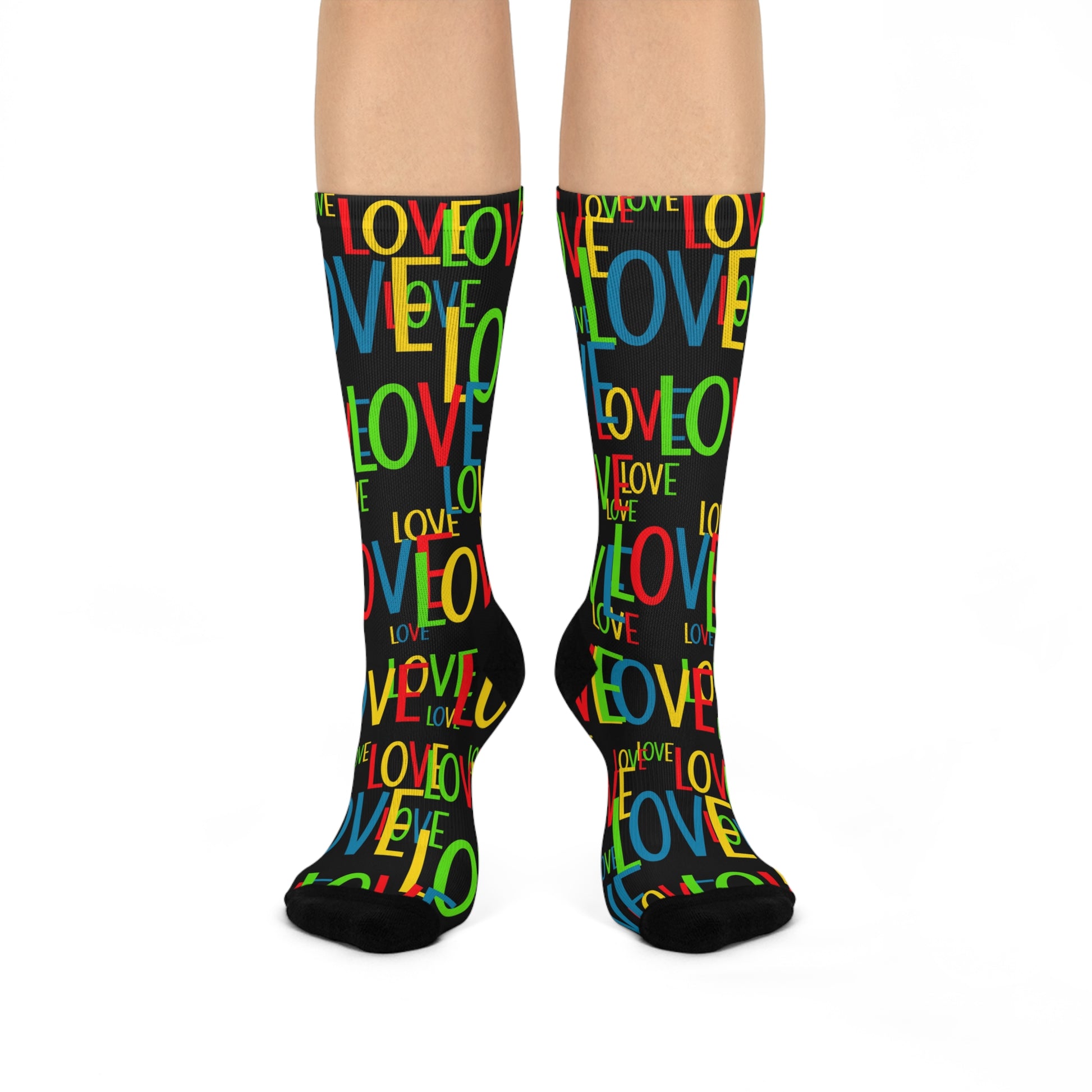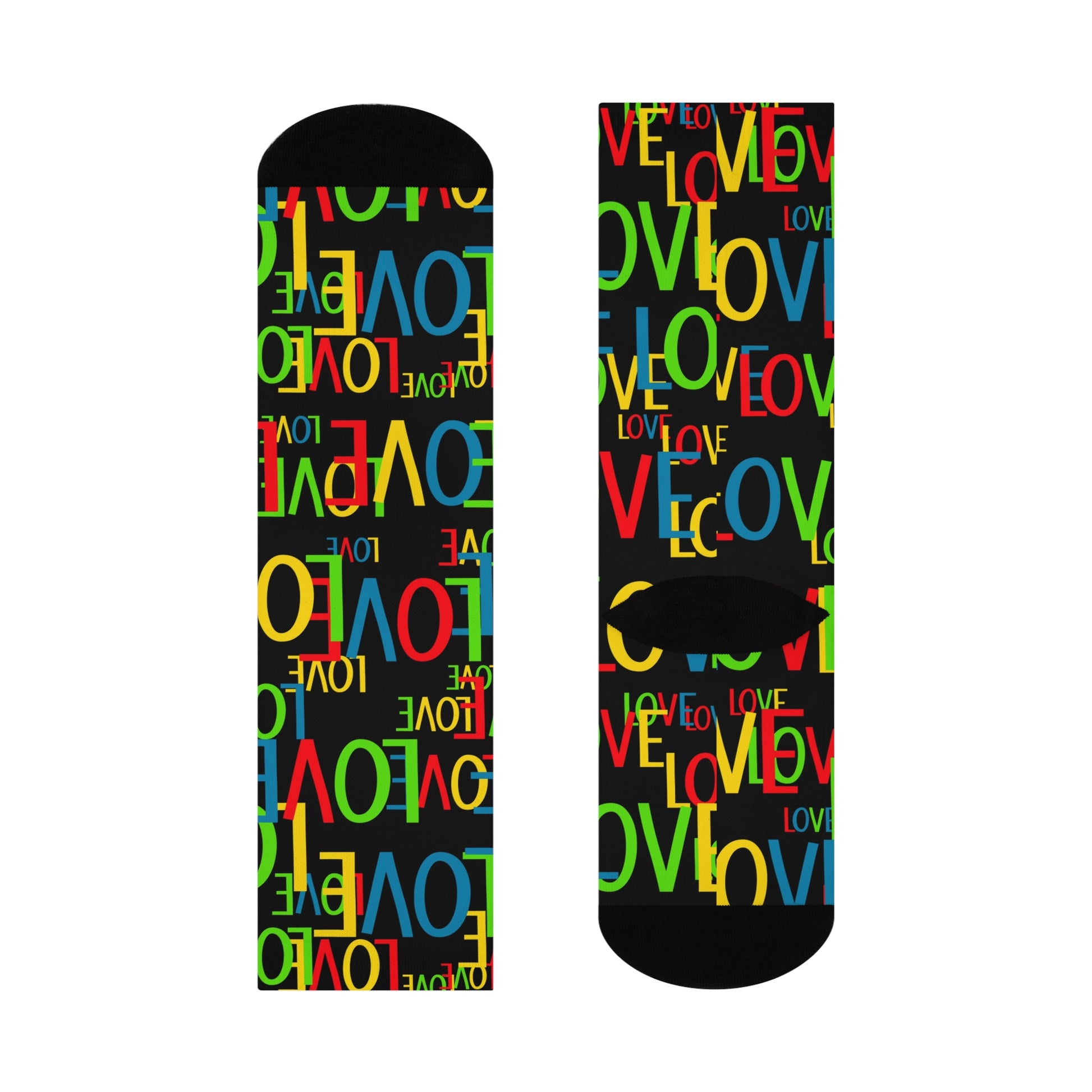 Featuring an all-over print bursting with colorful 'love' motifs, these socks bring a cheerful vibe to any outfit. Perfect for casual everyday wear, or as a playful statement piece in your dressiest looks, they are designed for comfort whether you’re tackling your day or enjoying a cozy night in. Ideal for everyone who appreciates fun accessories, these socks make a fantastic gift for friends, family, or even yourself.