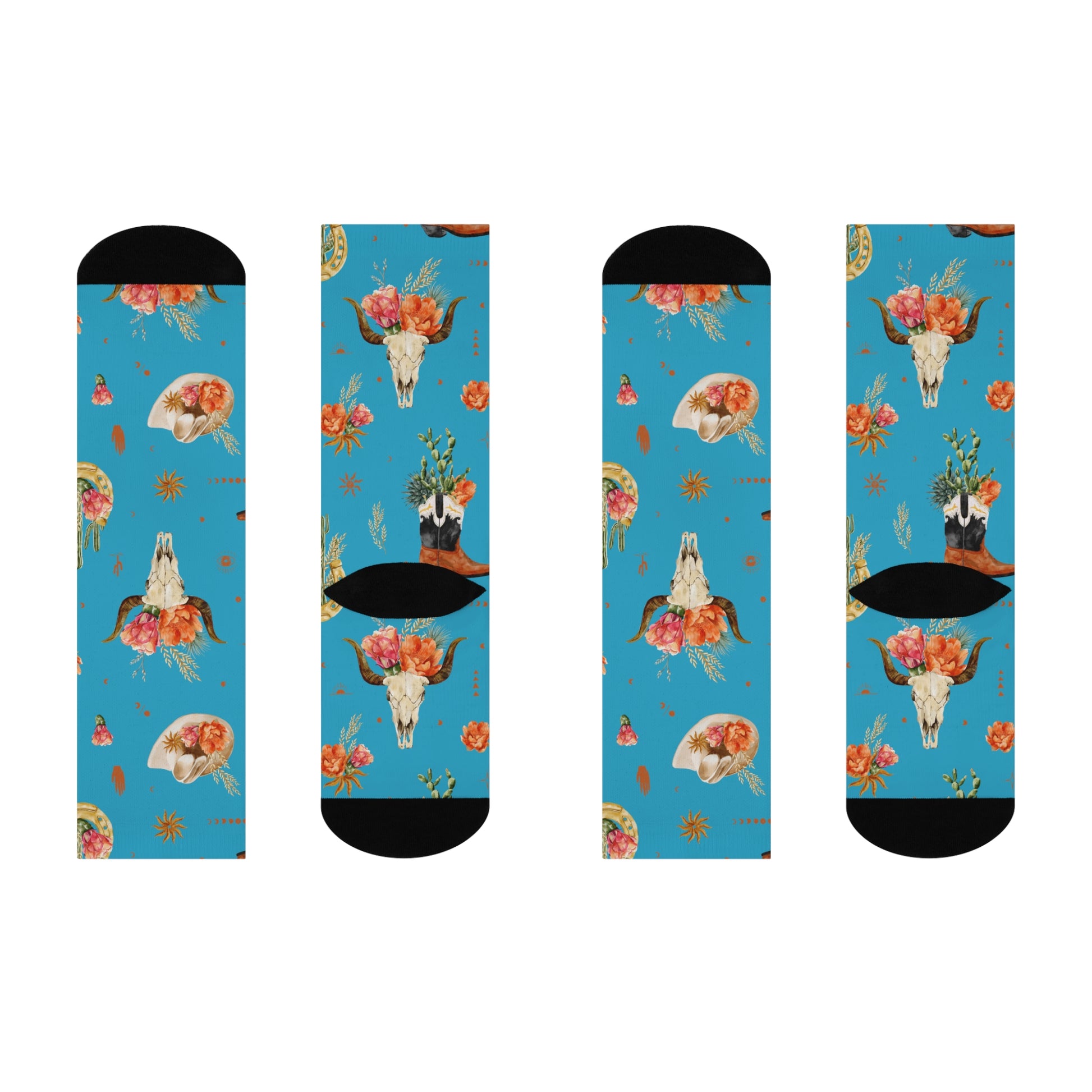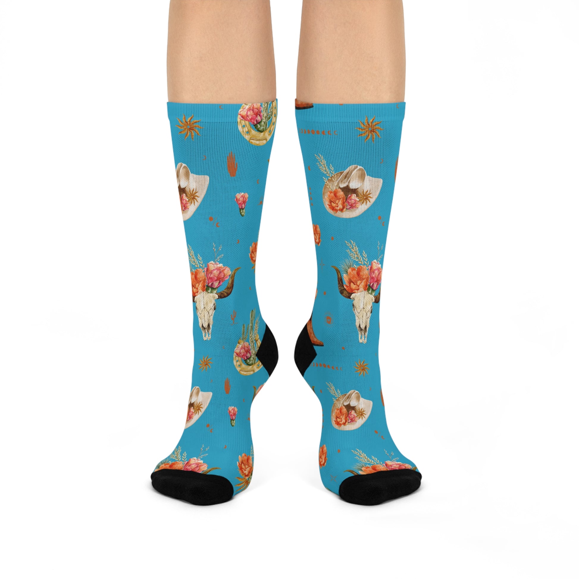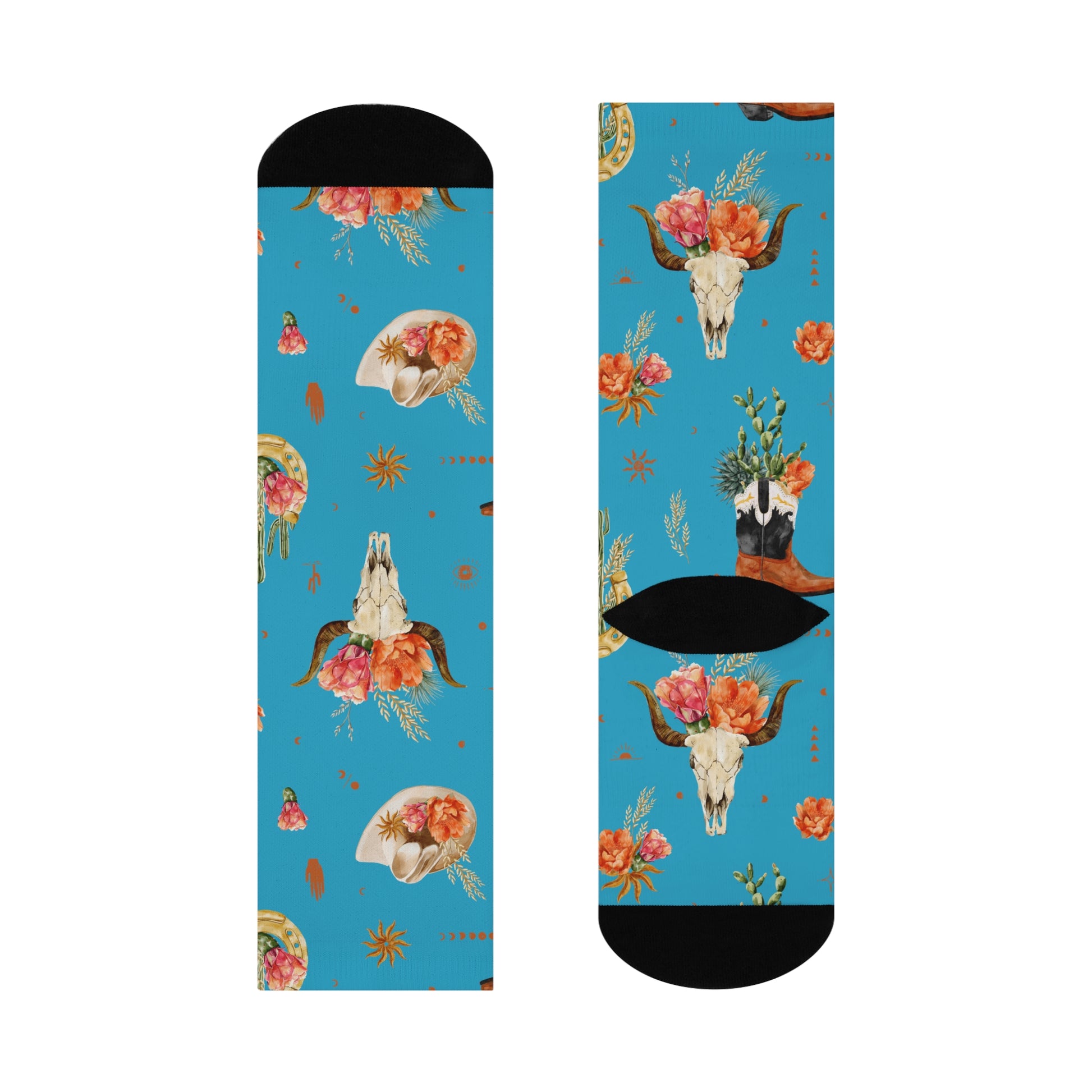 The vibrant longhorn pattern, featuring floral designs against a bold backdrop, adds a playful touch to any outfit. Perfect for casual hangouts or active days, these socks provide both style and comfort.