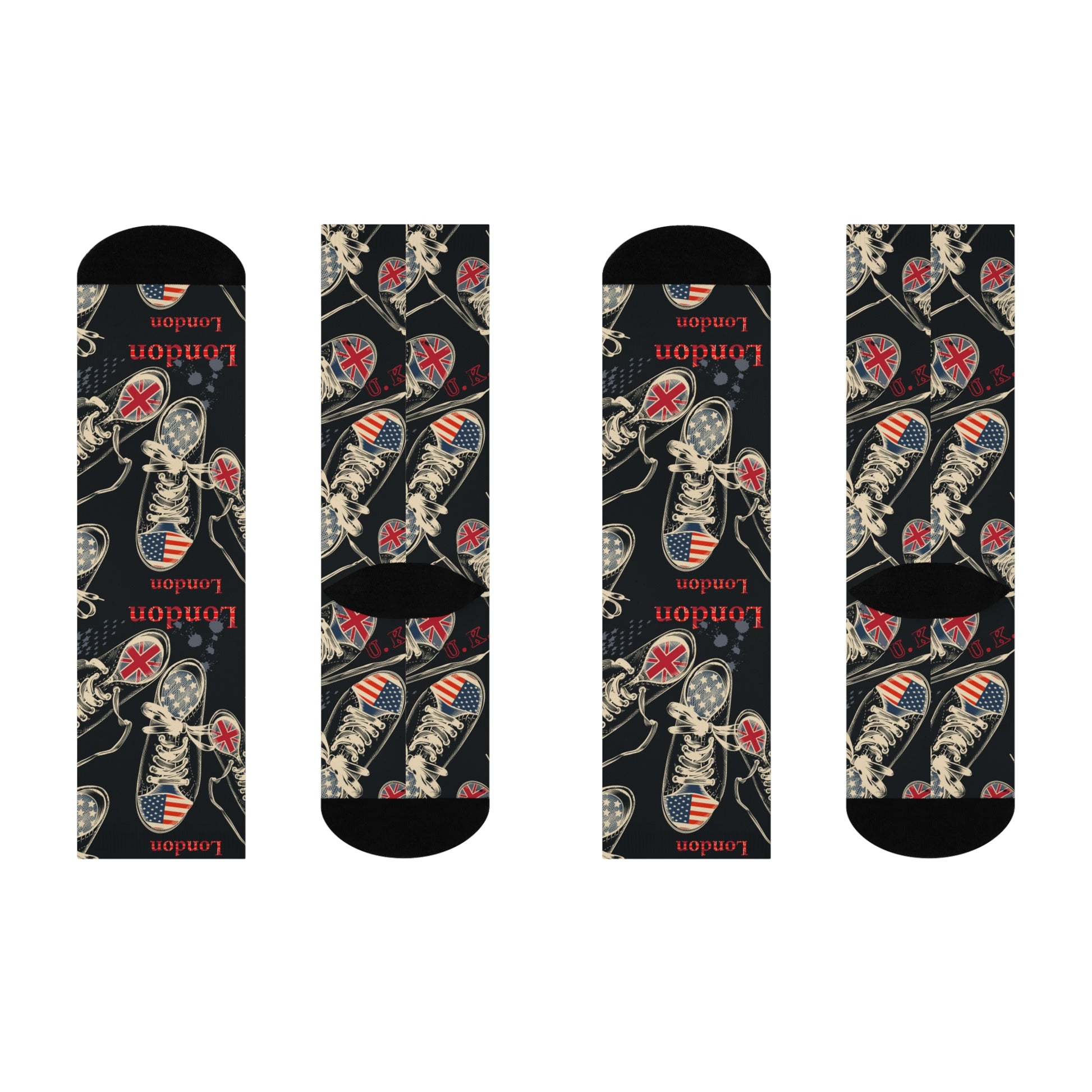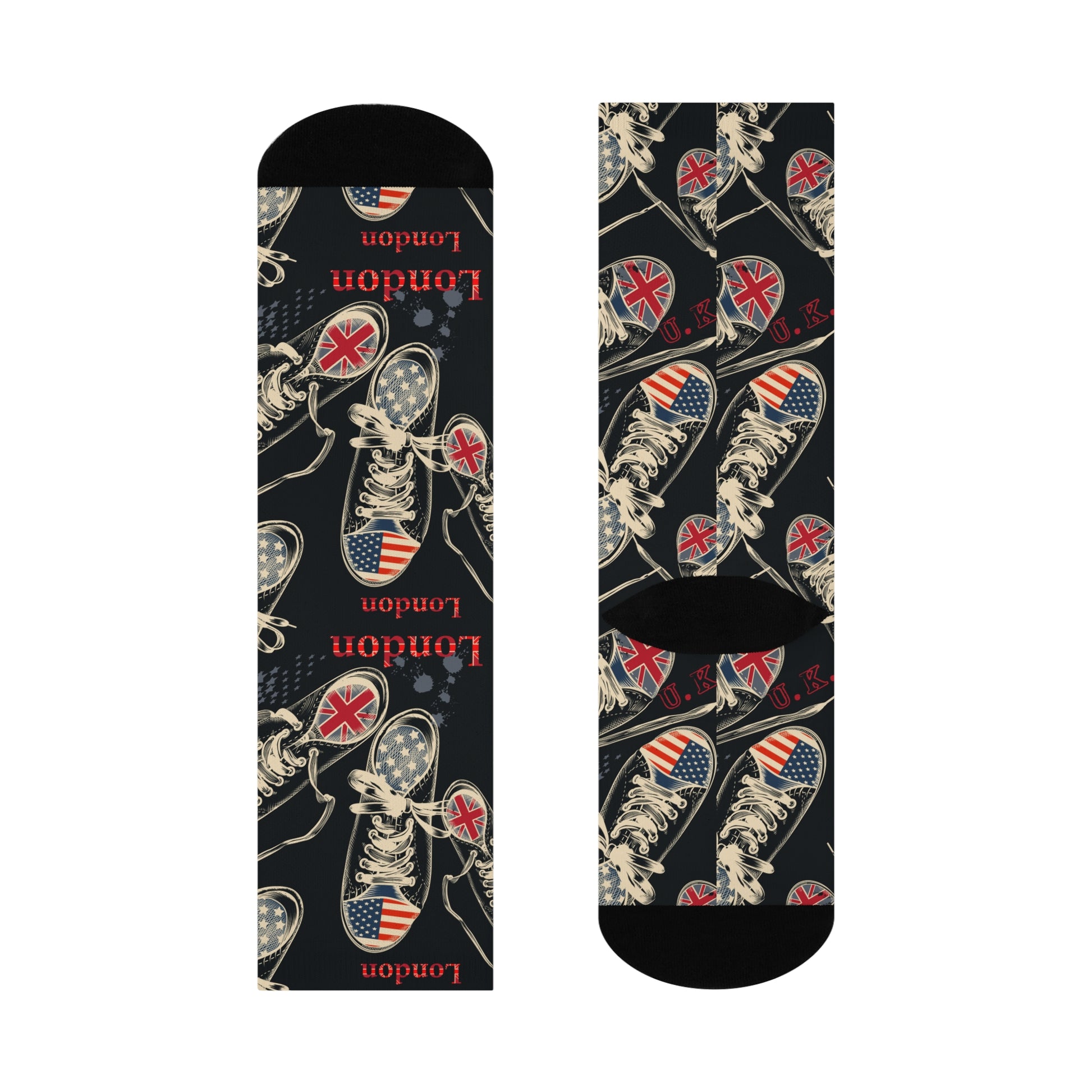 Crew length. All-over print design with solid black toe and heel. Cushioned bottoms. Material: 73% polyester, 18% nylon, 3% cotton, 6% spandex. One size fits women's size 5 US up to men's size 12 US.
